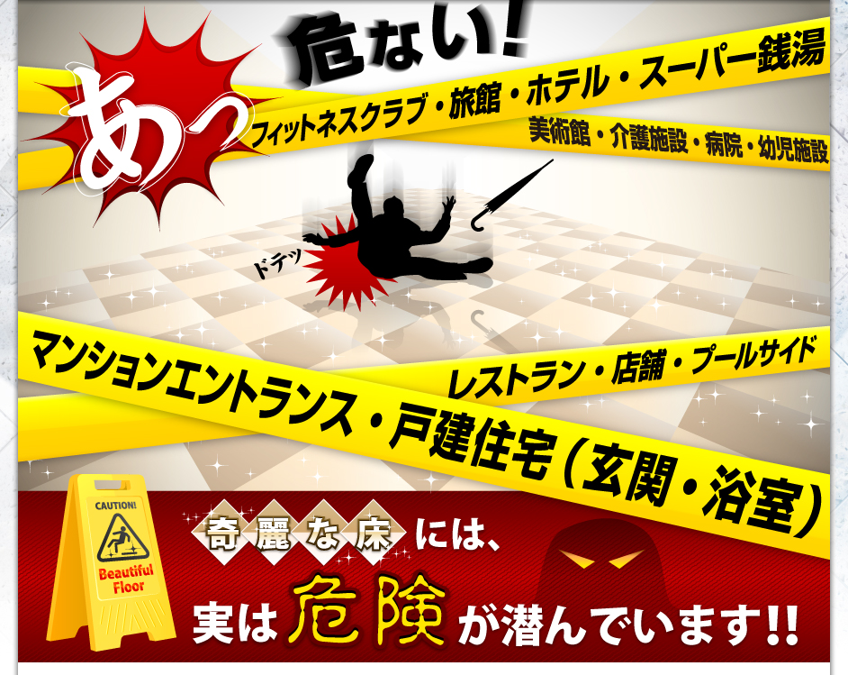 建築物の多様化が進む中、床石材も進化が進み美しい床材を目にすることが増えました。反面、美しさと引き換えに非常に滑りやすい床が増えてきています。